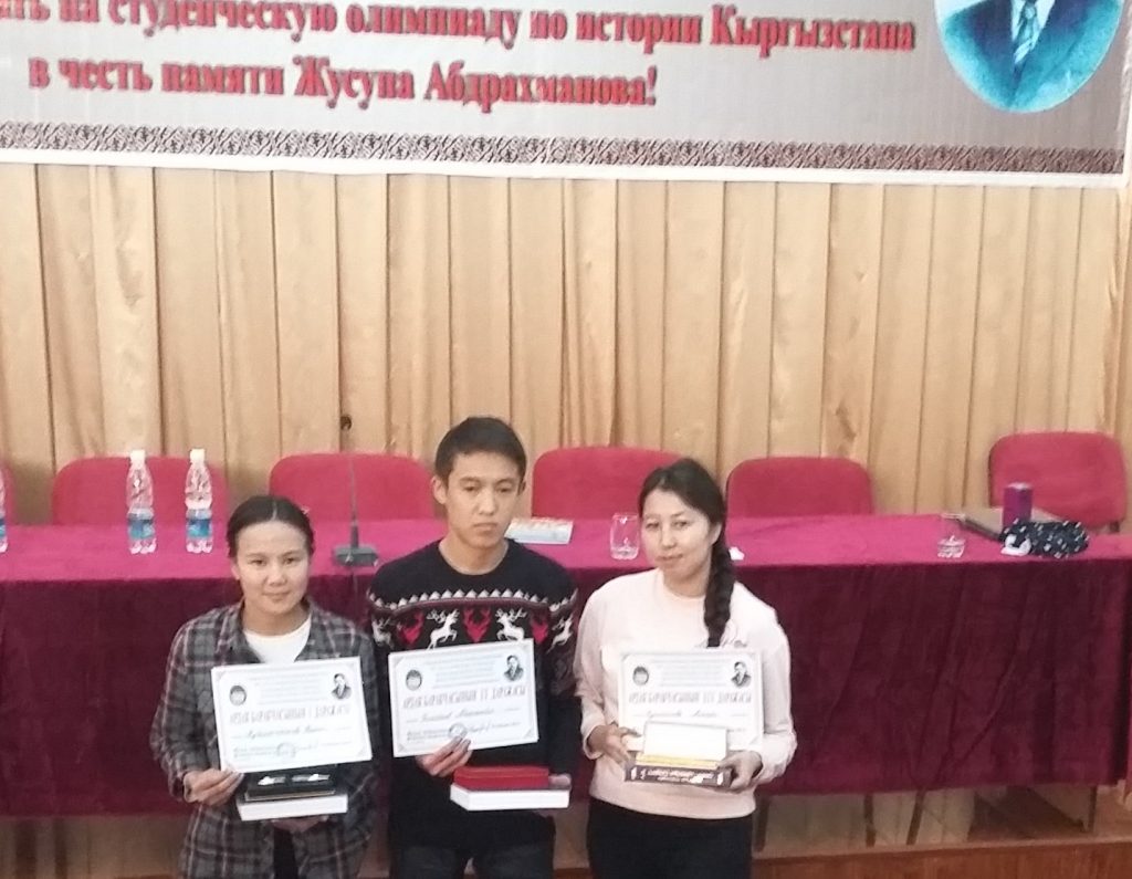 Студенты факультета Кыргызской филологии группы Кыргызский язык и литература Алияскаров Элдияр и Даниярова Гульбарчын были награждены почетными дипломами оргкомитета и ценными подарками.