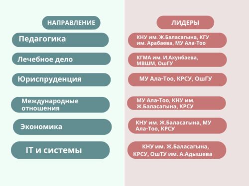 Одновременно с рейтингом школ, EdNet представил первый независимый рейтинг образовательных программ университетов Кыргызстана по шести наиболее востребованным направлениям. В опросе участвовали 806 преподавателей и 295 работодателей из всех регионов страны.