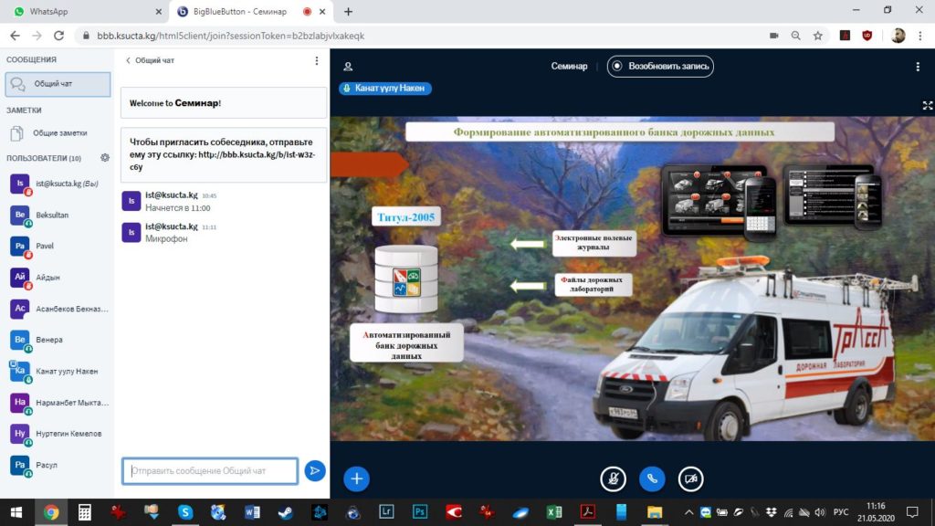 19 и 21 мая на кафедре автомобильные и железные дороги мосты и тоннели КГУСТА состоялся вебинар Проекта «Систем управления дорожными активами» (СУДА) Министерства транспорта и дорог Кыргызской Республики на тему: «Методы подсчета интенсивности на автомобильных дорогах и паспортизация дорог КР»